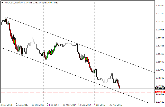 Во-первых, оззи – валюта страны, главным торговым партнером которой является Китай. А между тем рынок опасается, что торможение темпов экономического роста в Поднебесной будет сильнее, чем ожидалось. На китайском фондовом рынке произошел разрыв «пузыря»: он снижается уже четвертую неделю подряд, причем падение индекса Shanghai Composite от июньских максимумов приближается к 35%. Снова активно обсуждается риск «жесткой посадки» экономики КНР. Инвесторы понимают, что экономические проблемы Китая неминуемо отразятся и на экономике Австралии, и это также оказывает давление на обменный курс национальной валюты. Во-вторых, оззи входит в число высокорискованных активов, а беспокойство инвесторов по поводу Греции и Китая существенно подорвало интерес к таким инструментам. В-третьих, оззи – сырьевая валюта, а котировки многих сырьевых товаров (и в том числе железной руды, что особенно важно в случае Австралии) переживают падение – главным образом все из-за того же Китая. Под влиянием этих негативных факторов пара AUD/USD еще на прошлой неделе пробила уровень $0.75 – таким образом, исполнился мой майский прогноз по этой валютной паре. На этой неделе снижение «австралийца» продолжается, уже обновлены шестилетние минимумы ниже $0.74.