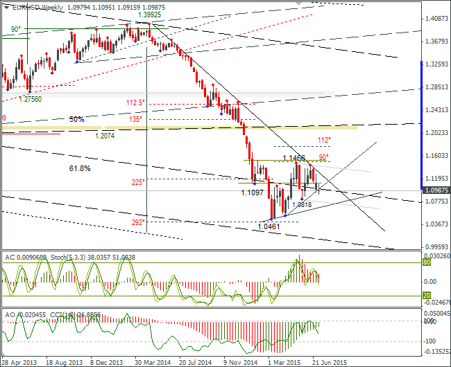 Продавцам пока не удаётся развить мощный нисходящий импульс. Евро/доллар забуксовал на уровне 1,10. Индикаторы смотрят вниз, поэтому ожидаю медвежье тело недельной свечи.
