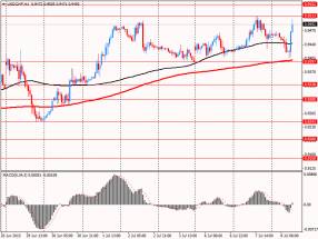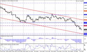 Предположения прошлого комментария о дальнейшем понижении на этой паре реализовались. Цена опустилась к новым более низким уровням и сейчас находится на отметках 0.7390/70. Индикаторы продолжают единогласно сигнализировать о преимуществе «медвежьих» настроений на рынке, что повышает вероятность снижения торгов к указанной ранее цели на уровне 0.7240/50. Правда, более детальный анализ предлагает рассматривать целевым уровнем более широкий диапазон поддержки – ценовой интервал 0.7280-0.7240/50.