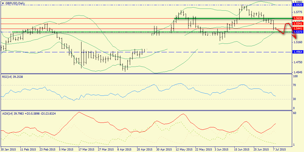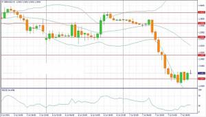 Дневной график: медведи давят при активном ADX, но впереди поддержка от нижней полосы (1.5373). Она может отбросить пару вверх, однако, при таких параметрах ADX, вероятно, случится пробой конверта и только затем пройдет откат вверх, в район средней полосы (1.5650).