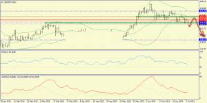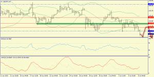 Дневной график: происходит попытка прорыва нижнего конверта Боллинджера, но параметры ADX недостаточны. Поэтому, даже в случае успешной атаки медведей, очень вероятен возврат в район средней полосы Боллинджера (123.12) и лишь затем можно будет ожидать полноценную импульсную волну вниз