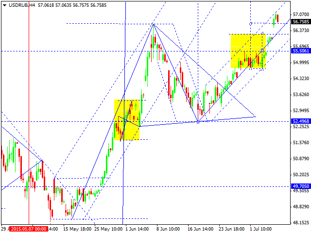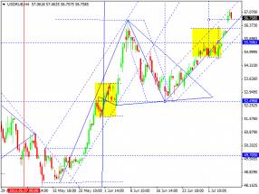Российский рубль продолжает торговаться в структуре роста к уровню 58.50. На сегодня рассматриваем возможность отработки цели и начало консолидации с разворотной структурой. Очередная цель на снижение рассматривается на уровне 52.50.