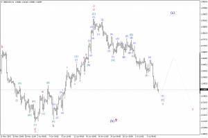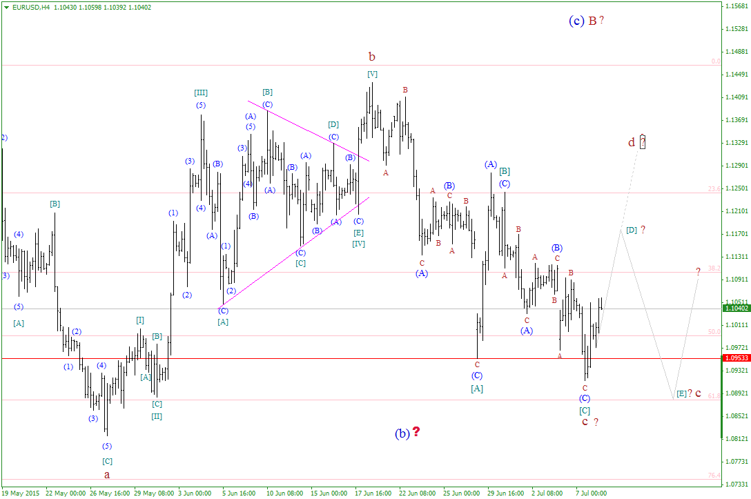 Таким образом, складывающаяся волновая ситуация позволяет предполагать, что волна (b), в В, все же, принимает форму горизонтального треугольника и в настоящий момент, валютная пара находится в завершающей стадии формирования его волны с, в (b), в В. Если это так и волна с, в (b), еще больше не усложнит свою волновую структуру, то отход цены от вчерашнего минимума может оказаться началом волны d, в (b), в В, предполагаемые цели которой расположены вплоть до уровня 13-й фигуры.