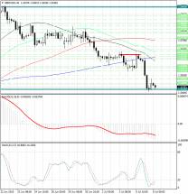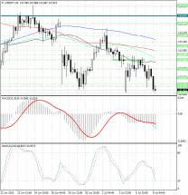 Гистограмма MACD по-прежнему расположена в отрицательной зоне и ниже своей сигнальной линии, продолжает плавно снижаться и тем самым подает сигнал на продажу USD/JPY.