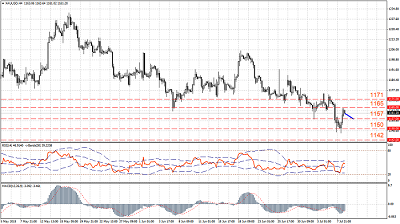 Медведи в ближайшем будущем могут достичь поддержки в области 1157, а её пробой даст им возможность достичь уровней 1150 и 1142. Прогнозы умеренно отрицательные, не обещающие ни резкого взлета, ни слишком сильного падения. Если при возобновлении роста сопротивление, находящееся на уровне 1165 будет пробито, быкам откроется путь до уровня 1171.