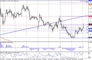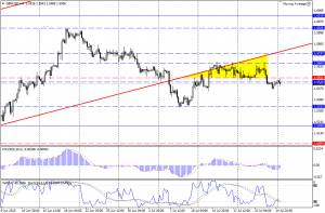 Продолжения нисходящего движения на этой паре не последовало. Цена вернулась к пробитой поддержке бокового коридора консолидации – уровню 1.5550/20, который стал хорошим сопротивлением, и сейчас тестирует этот статус на прочность. Торговля ведется на отметках 1.5510/20. Индикаторы сигнализируют о малой вероятности успеха этих стараний «быков» — R% и MACD без агрессии приподняли свои графики, а SS уверенно понижается и готов уже войти в зону перепроданности. Такой расклад, как правило, свидетельствует о предпочтениях понижению. Очевидно, в данной ситуации можно оставить предположения прошлого комментария в силе – вероятно падение цены к первой цели, отмеченной ранее на уровне 1.5330/40. Пробой этого уровня обозначит окончательное подтверждение победы «медведей» и даст аргументы ждать снижения цены к следующим целям на уровнях 1.5190/80 и 1.5050/60.