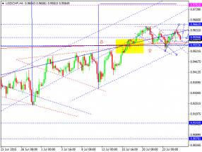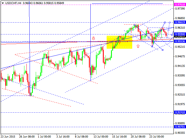 Валютная пара доллар франк торгуется в рамках консолидации на вершине роста. Ожидаем пробой вершины и отработку уровня 0.9662. Далее - опять возврат в центр консолидации. Затем - новый рост на отработку уровня 0.9762.