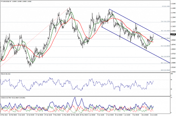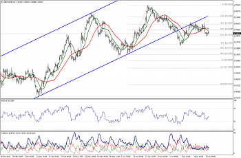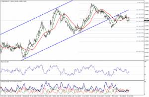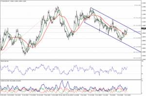 В пятницу пара попыталась пойти в рост, однако скользящие средние пресекли эту попытку и торги по прежнему идут ниже уровня 50% коррекции Фибоначчи. Тем не менее, мы не можем прогнозировать дальнейшее снижение пока не увидим пробой уровня поддержки 1,5470. Отметим, что ADX является отрицательным и мы предпочитаем оставаться вне рынка между уровнем сопротивления 1,5560 и уровнем поддержки 1,5470.