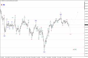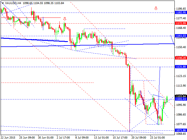 Таким образом, складывающаяся волновая ситуация подтверждает высказывавшееся ранее предположение о том, что после 21-го июля валютная пара перешла в стадию формирования волны (е), в [iv], возможные цели которой расположены вплоть до уровня 122-й фигуры. В то же время, текущая волновая картина, по прежнему, допускает вероятность возобновления роста котировок к уровню 125.00 и, как следствие, значительного усложнения волновой структуры волны (d), в [iv].
