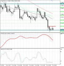 Курс валюты расположен значительно ниже скользящих средних с периодами 34, 55, 89 и 144, которые направлены вниз и указывают на сохраняющиеся медвежьи настроения (в среднесрочной перспективе), а также являются рядом уровней сопротивления 0.73575, 0.73775, 0.74025 и 0.7500.