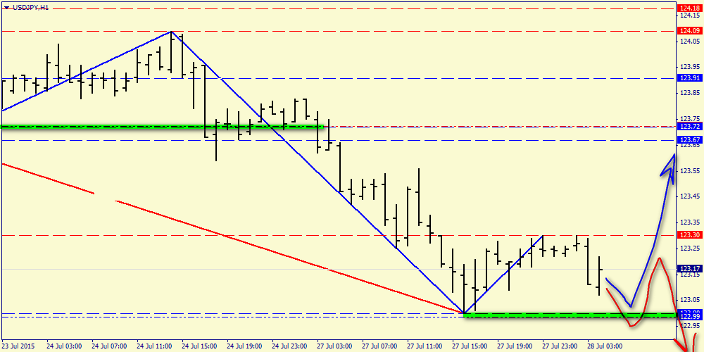 Часовой график: нисходящая структура, однако возможны два сценария. 1 - это локальный разворот вверх (для этого необходимо сохранить поддержку 123.00. 2 - уход под уровень 123.00 и дальнейшее снижение в направлении 122.45