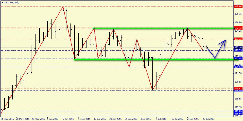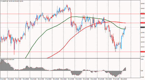 Дневной технический анализ по USD/JPY Сопротивление 3: Y124.62 (максимум 10 июня) Сопротивление 2: Y124.18 (максимум 23 июля) Сопротивление 1: Y123.90 (МА(200) для Н1) Текущая цена: Y123.76 Поддержка 1: Y123.00 (минимум 27 июля) Поддержка 2: Y122.40 (минимум 13 июля) Поддержка 3: Y122.00 (психологический уровень)