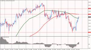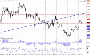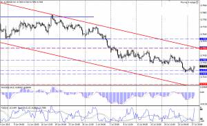 Сила поддержки в диапазоне 0.7280/40 остановила рост и спровоцировала откат вверх. Сейчас торговля ведется на отметках 0.7320/25. Часть индикаторов, R% и MACD, поменяли направление своих графиков на восходящее, но присутствие SS в зоне перепроданности предупреждает о коррекционном характере отката. Очевидно, в данной ситуации можно предположить, что на паре началась коррекция, после которой движение вниз возобновится. Т.е. ожидания «медвежьего» продолжения остаются доминирующими и сценарий предусматривающий движение к цели на более низком уровне 0.7140/00, сохраняет актуальность. Если же в процессе предполагаемой коррекции цена поднимется выше уровня 0.7380/70, то возврата к понижению придется ждать после теста на прочность линии тренда нисходящего канала (красные линии), совпадающей сейчас с сильным уровнем сопротивления 0.7500.