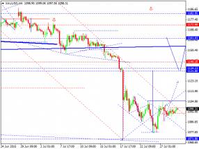 Золото сегодня торгуется в рост, предпринимая попытки пробоя канала снижения. Ожидаем подъём на пробой уровня 1104.90 с формирование фигуры продолжения. Цель волны рассматриваем на уровне 1131.80.