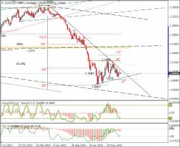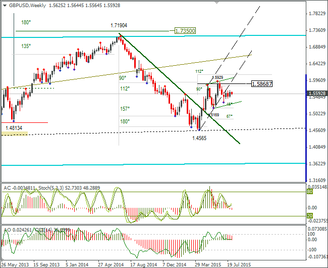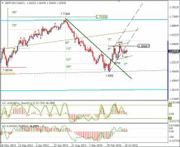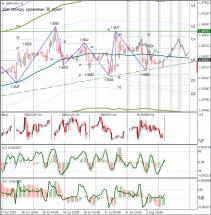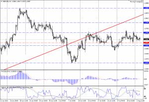 Консолидация в диапазоне ограниченном уровнями 1.5660-1.5550/20 продолжается. Цена остается зажатой в узком диапазоне и сейчас находится на отметках 1.5590/1.5600. Индикаторы продолжают демонстрировать нейтральность, указывая на сохраняющуюся неопределенность. В данной ситуации наибольшей видится вероятность продолжения бокового движения в сформировавшемся коридоре. О перспективах же можно будет судить при происшествии одного из двух событий — падение торгов под поддержку 1.5520, с закреплением, даст сигнал о преимуществе «медвежьих» настроений и начале реализации сценария предусматривающего движение пары к следующей цели — поддержке 1.5330/40. Пробой же сопротивления на уровне 1.5660 даст основание отдать предпочтения «бычьему» продолжению, в этом случае цель будет на уровне 1.5760/70, но не исключен и более сильный рост — до пробитой ранее линии тренда восходящего канала (красные линии).