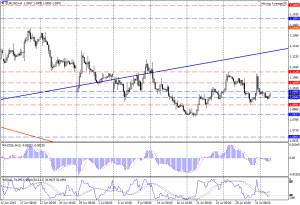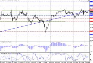 Сопротивление на уровне 124.30, отмечавшееся как ключевое на пути вверх, продолжает доказывать свою прочность. Попытки пробить это препятствие не увенчались успехом, и цена сейчас консолидируется на уровне 124.00/05. Индикаторы показывают снижение «бычьего» настроя, а уклон вниз SS предупреждает о возможном откате торгов к более низким уровням, таким как поддержка на 123.40/30. Тем не менее, даже если некоторое снижение цены будет иметь место, то его следует рассматривать как часть коррекции в рамках доминирующего восходящего тренда. Ожидания остаются на стороне возобновления «бычьего» движения. Пробой барьера на 124.30/40 просигнализирует о скором подъеме пары к локальным максимумам, расположенным сейчас на уровнях 125.00/10, 125.70.