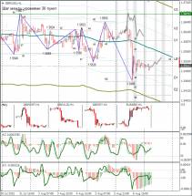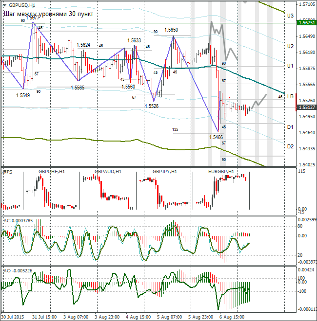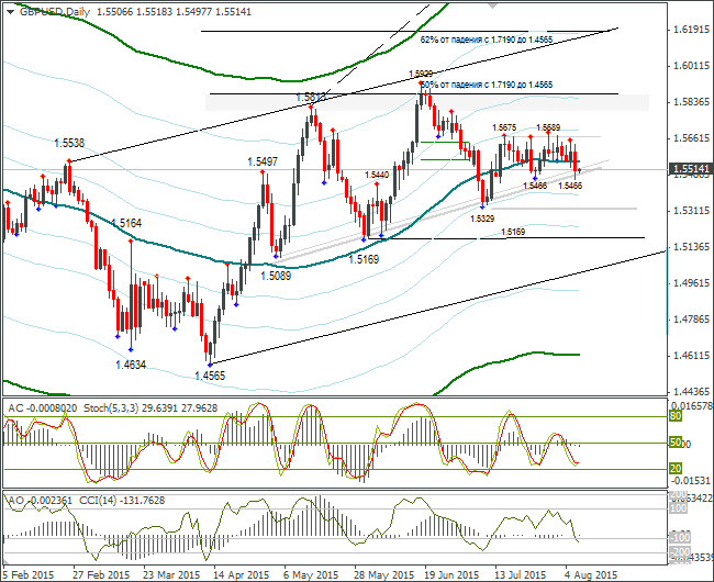 Здесь мы продолжаем следить за нисходящей структурой от 31 июля. Краткосрочное нисходящее движение возможно в коридоре 1.5480 — 1.5460, пробой последнего значения должен сопровождаться выраженным движением, здесь цель — 1.5427, в коридоре 1.5427 — 1.5409 консолидация цены. Потенциальным значением для низа считаем уровень 1.5383, по достижении которого ожидаем откат кверху. Краткосрочное восходящее движение возможно в коридоре 1.5539 — 1.5560, пробой последнего значения приведет к углубленной коррекции, здесь цель — 1.5591, этот уровень является ключевой поддержкой для нисходящей структуры от 31 июля.