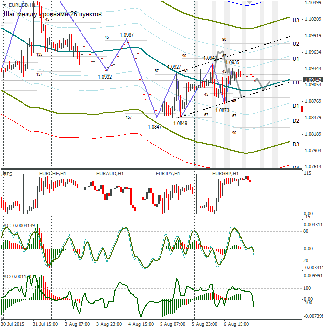 Здесь мы продолжаем следить за развитием нисходящего цикла от 31 июля, на текущий момент цена находится в коррекции. Продолжения движения книзу ожидаем после прохода ценой шумового диапазона 1.0851 — 1.0829, в данном случае цель — 1.0782, в коридоре 1.0782 — 1.0756 консолидация цены. Потенциальным значением для низа считаем уровень 1.0724, по достижении которого ожидаем откат кверху. Консолидированное движение возможно в коридоре 1.0909 — 1.0931, пробой последнего значения приведет к углубленной коррекции, здесь цель — 1.0981, этот уровень является ключевым сопротивлением для развития восходящей структуры.