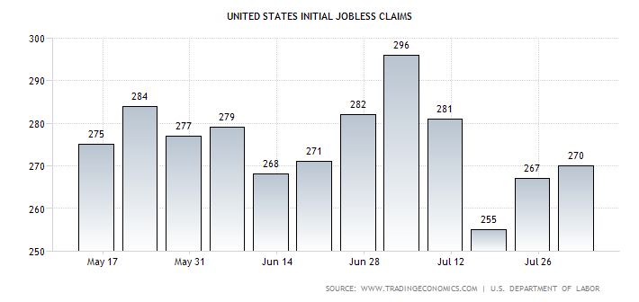 Таким образом, в июле мы видим снижение среднего количества первоначальных заявок на пособие по безработице на 2.5% по сравнению с июнем. Если пропорциональным образом в июле снизился и уровень безработицы, то мы можем ожидать от сегодняшнего отчета нового семилетнего рекорда – падение безработицы до 5.2% против 5.3% в июне.