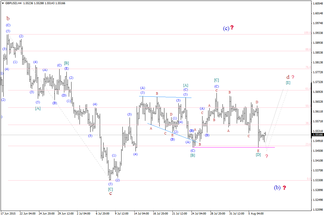 Сложившаяся при этом волновая ситуация (с некоторыми натяжками) позволяет предполагать, что валютная пара значительно усложнила волновую структуру волны d, в (с), которая приняла форму протяженной горизонтальной коррекции. Если это так, то несмотря на возможность еще большего усложнения волны d, в (с), можно ожидать возобновления роста котировок к уровню 1.5700, после обнародования сегодняшних данных по рынку труда в США.