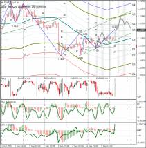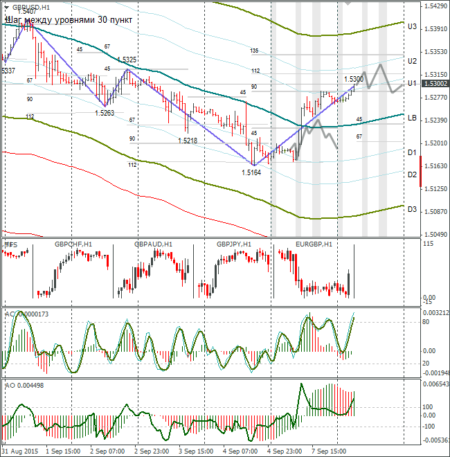 В понедельник курс фунт/доллар вырос до 1,5287 на фоне продаж евро в кроссе евро/фунт. Активность трейдеров на американской сессии была низкая из-за праздников в США и Канаде. Сегодня рост в Азии продолжился. В настоящее время фунт/доллар торгуется выше 135 градуса по 1,5367. Прогноз не стал переделывать. Цель по нему перевыполнили. От линии U3 жду коррекции в направлении к линии lb.