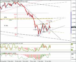 Евро пытается отбиться от дневной линии Lb. В настоящее время ситуация несильно изменилась при росте до 1,1218. А вот закрытие недели выше 1,1332, отменил сигнал по пинбару с максимумом 1,1712.