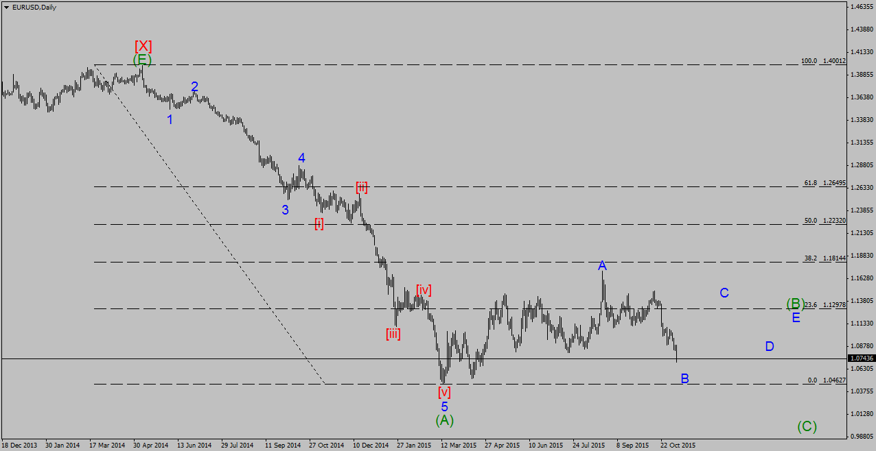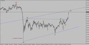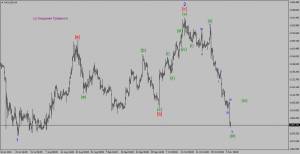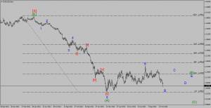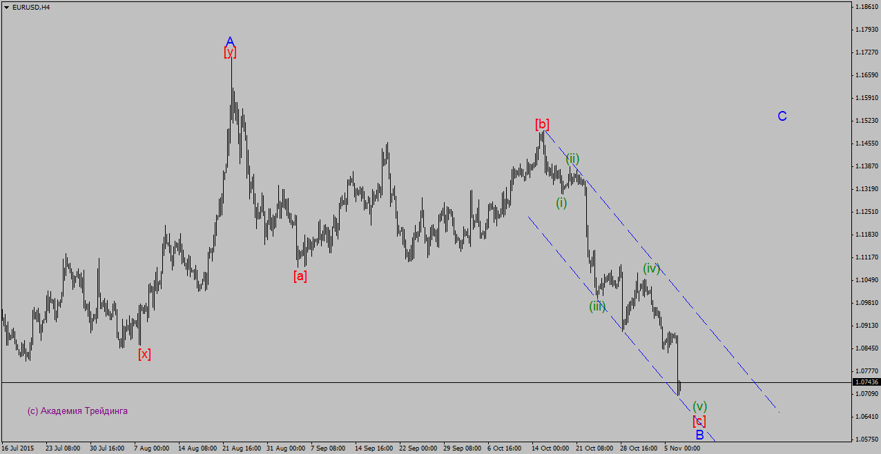 В таком случае мы находимся у среднесрочных минимумов. Импульс в волне [c] of B, на мой взгляд, близок к завершению. Вероятно, формируется волна iv of (v). Цель для импульса - нижняя граница канала. В случае пробоя линии поддержки шансы на формирование треугольника в волне (B) снижаются.