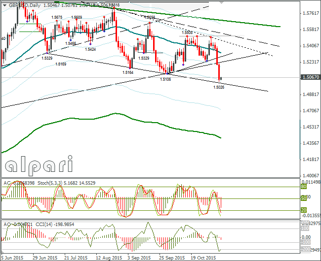 GBP/USD упал до 1,5026. Цена встретилась с поддержкой (проекция от минимумов 1,5229-1,5164-1,5106). Дневные индикаторы смотрят все вниз. Значит, после отката на часах можно будет ожидать нового снижения.