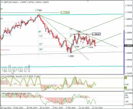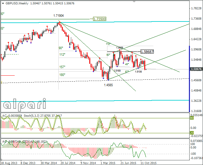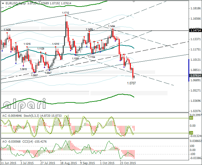 Курс евро/доллар закрепился ниже зоны поддержки 1,0807-1,0838. Единая валюта будет ослабляться к доллару на ожиданиях принятия новых стимулирующих мер экономики со стороны ЕЦБ и повышения ставки ФРС США в декабре. Моя цель - 1,0520 (минимум от 14.04.15).