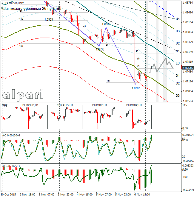 Недостаточно сильная макроэкономическая статистика из стран еврозоны (в частности, сегодня были опубликованы данные по торговому балансу Германии, положительное сальдо которого сократилось до 19,4 млрд против прогноза роста до 20,0 млрд евро) все больше убеждает рынок в том, что экономике необходимо дополнительное стимулирование. А это значит, что намеки ЕЦБ на возможное изменение программы количественного смягчения в декабре вполне могут стать реальностью. На этом фоне настрой австралийского регулятора, который на прошлой неделе не стал снижать ставу, выглядит более агрессивным. Более того, РБА отметил более благоприятные перспективы состояния экономики страны, которая продолжает расти умеренными темпами. Именно разница в настроениях в отношении ставок может оказывать влияние на динамику пары.