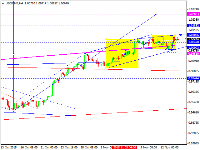 Валютная пара доллар франк торгуется на расширение консолидации вверх с перекрытием уровня 1.0107. Далее - тест уровня 1.0050 сверху. Затем - опять рост на отработку очередной цели по тренду вверх на уровне 1.0185.