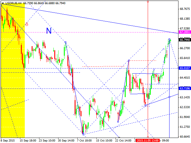 Российский рубль сегодня торгуется на снижение. Рассматриваем начало развития волны на отработку уровня 60. Далее - тест снизу 64. Затем - опять по тренду вниз, на отработку уровня 57.