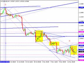 Валютная пара евро доллар отработала тест нижней границы консолидации. Практически получена структура очередной матрицы на снижение. На сегодня рассмотрим возврат на тест центра снизу и продолжение снижения на обновление минимума. Основной сценарий - на продолжение тренда с отработкой уровня 1.0300.