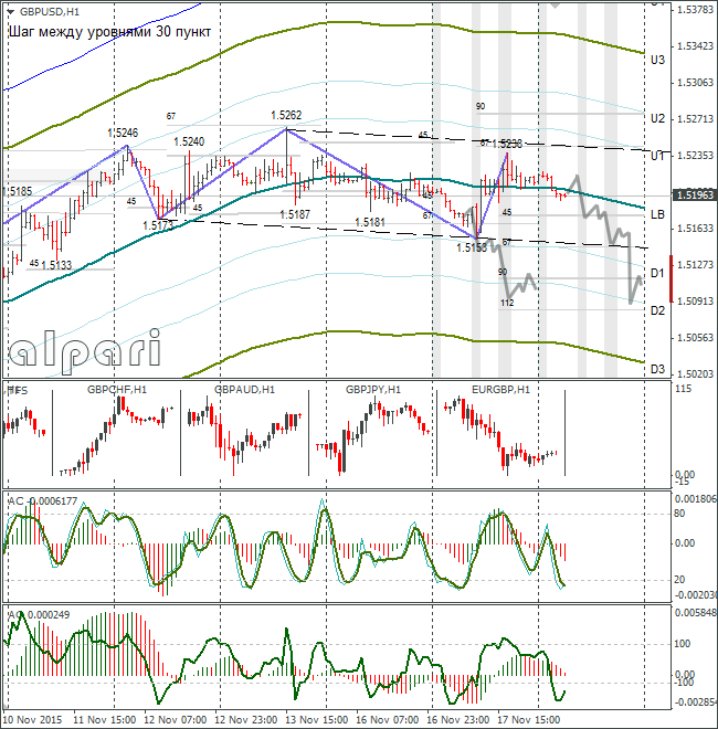 Курс фунт/доллар три дня торгуется между линиями U1-D1. Ожидания по вчерашнему дню не оправдались. После публикации данных по инфляции в Великобритании курс GBP/USD вернулся к 1,5216, затем поднялся до 1,5238 на слабых данных по промышленному производству в США.