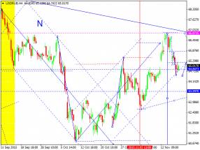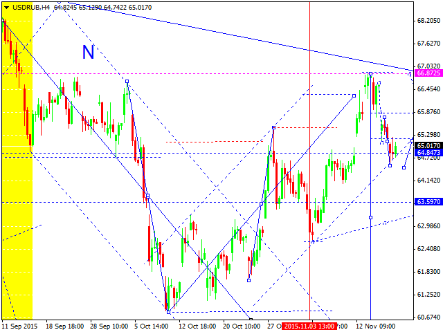 Российский рубль отработал первую структуру волны снижения. На сегодня рассматриваем возможность небольшой коррекции к уровню 65.75, тест снизу. Далее будем рассматривать развитие очередной волны снижения на отработку уровня 63.60. Затем - тест снизу 64.80. После - опять снижение по тренду.