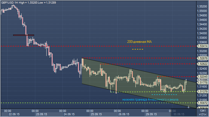 Фунт/доллар. Технический взгляд Сопротивление 4: $1.5389/92 - область прорыва на часовом графике 22 сентября Сопротивление 3: $1.5344 - минимум 22 сентября Сопротивление 2: $1.5258 - максимум 25 сентября Сопротивление 1: $1.5204 - максимум 29 сентября Текущий курс валютной пары: $1.5189 Сопротивление 1: $1.5124 - нижняя проектируемая граница 4-месячного канал Сопротивление 2: $1.5087 - 61,8% коррекции Фибоначчи от $1.4568-$1.5927 Сопротивление 3: $1.5011 — отмеренный ход (равная цель падения) от $1.5657 Сопротивление 4: $1.5007 — 2%-ная волатильность