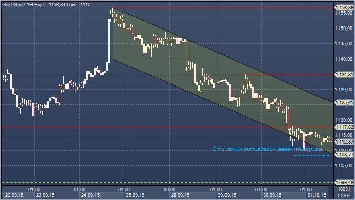 Золото. Технический взгляд Сопротивление 4: $1134,2 — максимум 29 сентября Сопротивление 3: $1128,5 — минимум 28 сентября, теперь сопротивление Сопротивление 2: $1123,3 - первоначальный минимум 30 сентября, в настоящее время - сопротивление Сопротивление 1: $1117,6 - часовое сопротивление Цена: $1112,87 Поддержка 1: $1108,3 — 2-месячная восходящая линия поддержки Поддержка 2: $1099,4 — минимум 11 сентября, 76,4% от $1078.1- $1168,4 Поддержка 3: $1093,2 — нижняя граница 6-недельного медвежьего канала Поддержка 4: $1078,1 - минимум 24 июля
