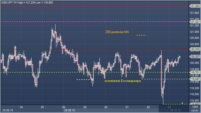 Доллар/иена. Технический взгляд Сопротивление 4: Y121.82 - минимум 21 августа, в настоящее время - сопротивление Сопротивление 3: Y121.32 - максимум 10 сентября Сопротивление 2: Y120.88 - 200-дневное скользящее среднее значение Сопротивление 1: Y120.44 - часовое сопротивление 28 сентября Цена: Y120.03 Поддержка 1: Y119.70 - часовая поддержка 2 октября Поддержка 2: Y119.46 - основание Боллинджера Поддержка 3: Y118.84 — нижняя граница недельного канала Боллинджера Поддержка 4: Y118.68 - минимум 2 октября