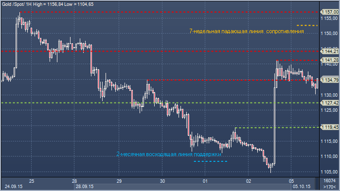 Золото. Технический взгляд Сопротивление 4: $1156,3 - максимум 24 сентября Сопротивление 3: $1152,6 - 7-недельная падающая линия сопротивления Сопротивление 2: $1144,2 - 76,4% коррекции Фибоначчи $1105,2-$1156.3 Сопротивление 1: $1141,1 - максимум 2 октября Цена: $1135,7 Поддержка 1: $1127,4 - часовая поддержка Поддержка 2: $ 1118,9 - максимум 1 октября, теперь поддержка Поддержка 3: $ 1105,2 - минимум 2 октября Поддержка 4: $ 1099,4 - минимум 11 сентября, 76,4% Фибоначчи от $1078.1-$1168,4