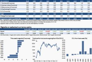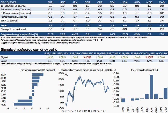 На этой неделе наша торговая система G10 FX Financial Scorecard рекомендует к покупке: евро, австралийский доллар и доллар США, а к продаже: норвежскую крону, японскую иену и канадский доллар (вес в общем портфеле указан в таблице ниже). Рекомендации прошлой недели привели к прибыли в размере 1%. Покупки норвежской кроны и канадского доллара проявили себя наиболее хорошо. Следующая публикация сигналов модели состоится 12 октября