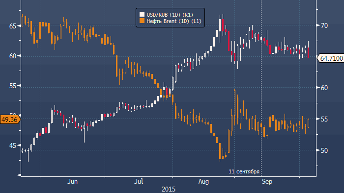 Рубль достиг максимума за последние пять недель по отношению к доллару на фоне роста цен на нефть и возросшего спроса на рискованные и высокодоходные активы после охлаждения ожиданий повышения ставки ФРС в нынешнем году — в результате выхода разочаровывающего отчета по занятости в США. Котировки нефти эталонных марок растут в понедельник второй день подряд после данных о падении числа действующих буровых установок в США до минимума за пять лет. Цены ноябрьских фьючерсов на нефть Brent на лондонской бирже ICE Futures к 18.35 мск прибавляют 3,22% до $49.77 за баррель. На минувшей неделе число нефтяных установок в США снизилось на 26 - до 614, по данным нефтесервисной компании Baker Hughes. Показатель упал на 60% за последний год и находится на минимальной отметке за пять лет. При этом он снижался по итогам пяти последних недель подряд. Продолжающееся замедление темпов наращивания добычи обещает в будущем снижение переизбытка нефти на мировых рынках.