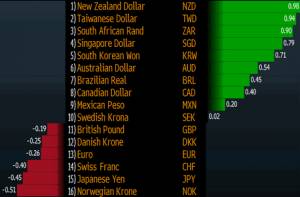 В понедельник доллар продемонстрировал смешанную динамику, подорожав против таких тяжеловесов, как евро, иена и фунт и подешевев против товарных и прочих более высокодоходных валют, вроде киви, аусси и луни на фоне явного роста аппетита к риску. Главным фаворитом инвесторов стал киви, немного оправившийся на фоне неплохого роста товарного и фондового рынков от понесенных в третьем квартале потерь, связанных с опасениями относительно перспектив китайской экономики. «Слабые данные по рынку труда США были восприняты рынком в качестве зеленого сигнала на покупку «риска» (прим. ProFinance.ru: теперь котировки фьючерсов на ставку оценивают вероятность ее повышения ФедРезервом в октябре и декабре в 10% и 37% соответственно)», - отмечает Дэниэл Кацив из BNP Paribas. – «Впрочем, если FOMC так и не повысит ставки до конца текущего года, то произойдет это, вероятно, из-за проблем мировой экономики и волатильности финансового рынка, а такая обстановка не очень благоприятствует покупке высокодоходных валют». В приведенной ниже таблице отражено изменение курса различных валют (в против доллара США в понедельник