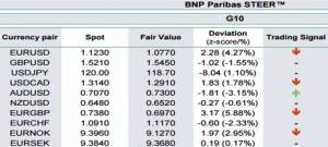 Валютные стратеги BNP Paribas обновили свою еженедельную оценку ситуации на валютном рынке, в подготовке которой используется квантовая модель «STEER», довольно успешно зарекомендовавшая себя с точки зрения точности своих прогнозов. Напомним, что данный банк является пионером использования данного подхода к оценке «справедливости» текущих валютных курсов. Основу данной методики представляет взаимосвязь между процентными ставками, стоимостью акций и ценами на сырьевые товары. Ниже приведена таблица с указанием валютной пары, ее текущего курса, «справедливой» цены, дельты между двумя предыдущими параметрами и сигналом на покупку/продажу.