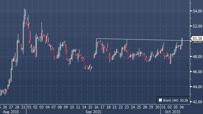 Цены на нефть заметно растут во вторник в ожидании недельных данных по запасам сырья в США. Так, нефть марки Brent впервые с 23 сентября подорожала выше психологически важного уровня в 50 долларов за баррель. По состоянию на 16.57 мск котировки ноябрьских фьючерсов на североморскую смесь Brent выросла на 2,48% до 50.47 доллара за баррель. Росту цен способствует широкий спрос на все высокорискованные активы, усилившийся после пятничной статистики по рынку труда США, отодвинувшей сроки первого повышения ставки ФРС.