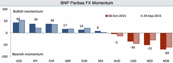 Валютные стратеги BNP Paribas обновили еженедельно публикуемую оценку текущей ситуации на валютном рынке, сгенерированную системой FX Momentum. Как следует из ее названия, система оценивает силу валютных трендов, исходя из текущей динамики валютных курсов, ставок и поведения фондового рынка. В приведенной ниже таблице указаны текущие оценки силы тренда основных валют по шкале от -100 (сильнейший медвежий моментум) до +100 (сильнейший бычий моментум).