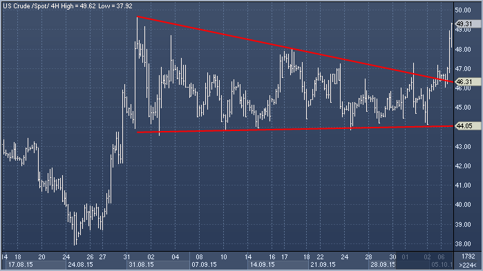 Во вторник рост нефтяных цен продолжился. Дополнительное ускорение он получил при пробитии технического сопротивления $50 по Brent. За два дня рост составил 11%. Из причин роста отметим слабые данные о рынке труда США за сентябрь (это подталкивает Федрезерв перенести дату начала подъема учетной ставки на более поздний период), слабость доллар, снижающееся количество активно работающих буровых в США, а также общее снижение добычи. За месяц добыча в США снизилась на 120 тыс. барр./день. По данным API, запасы нефти в стране за неделю уменьшились на 1,2 млн барр. Сегодня будет опубликована официальная статистика от Минэнерго.