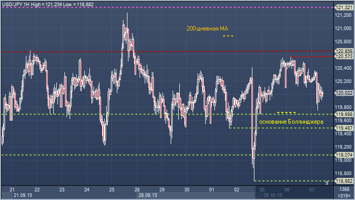 Доллар/иена. Технический взгляд Сопротивление 4: Y121.82 - минимум 21 августа, в настоящее время - сопротивление Сопротивление 3: Y121.32 - максимум 10 сентября Сопротивление 2: Y120.89 - 200-дневное скользящее среднее значение Сопротивление 1: Y120.57 - максимум 6 октября Цена: Y120.02 Поддержка 1: Y119.69 — часовое основание 7 октября, основание Боллинджера Поддержка 2: Y118.84 - основание недельного Боллинджера Поддержка 3: Y118.68 - минимум 2 октября Поддержка 4: Y118.23 - часовая поддержка 24 августа
