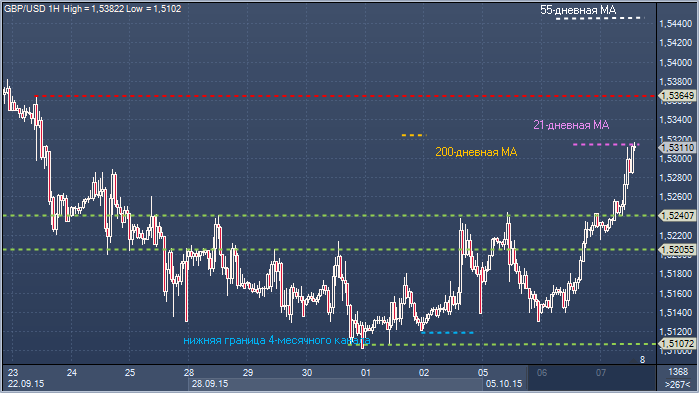 Фунт/доллар. Технический взгляд Сопротивление 4: $1.5446 - 55-дневное скользящее среднее значение Сопротивление 3: $1.5370 - максимум 23 сентября Сопротивление 2: $1.5323 - 200-дневное скользящее среднее значение Сопротивление 1: $1.5314 - 21-дневное скользящее среднее значение Цена: $1.5311 Поддержка 1: $1.5240 - поддержка на часовом графике 7 октября Поддержка 2: $1.5205 - часовая поддержка 6 октября Поддержка 3: $1.5135 - минимум 6 октября Поддержка 4: $1,5106 - месячный минимум 30 сентября и 1 октября