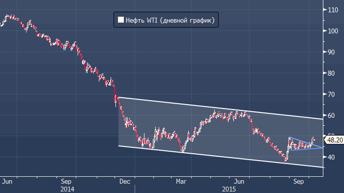 Заседание ОПЕК состоится 4 декабря в Вене (Австрия). Здесь не приходится ожидать, что Картель примет решение снизить квоты. Санкции с Ирана могут быть сняты в течение 1 квартала 2016 года. Поэтому поддержки со стороны предложения ценам на нефть ждать не приходится. Стабилизация обусловлена надеждами в отношении сигналов увеличения потребления. Сентябрьская консолидация цен вылилась в возвращение к 50 долларам за баррель (по WTI). Для подтверждения потенциала более существенного роста (до 55 — 58 долларов за баррель) потребуются дополнительные позитивные сигналы со стороны спроса. С учетом текущих уровней в районе $48 за баррель приближение к отметке 45.00 должно сопровождаться увеличением активности покупателей (на растущем объеме). Это станет сигналом сохраняющегося потенциала развития восходящего движения.