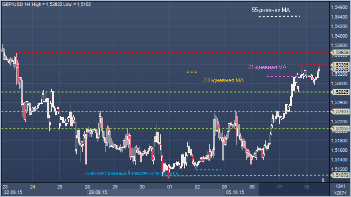 Комментарий:: восстановление от минимума прошлой недели привело к превышению 21 - ($1.5313) и 200 - ($1.5322) дневного скользящего среднего значения в среду, но до сих пор быкам не хватало сил закрепиться выше этих уровней. Дневные осцилляторы корректируются от уровней перепроданности и продолжают поддерживать дальнейшее повышение цен, тем более, что слои поддержки накопились. Медведи смотрят на то, чтобы закрыться ниже $1.5240, чтобы подтвердить медвежий уклон и сместить акцент обратно к повторному тестированию опорной области $1.5089-1.5105.